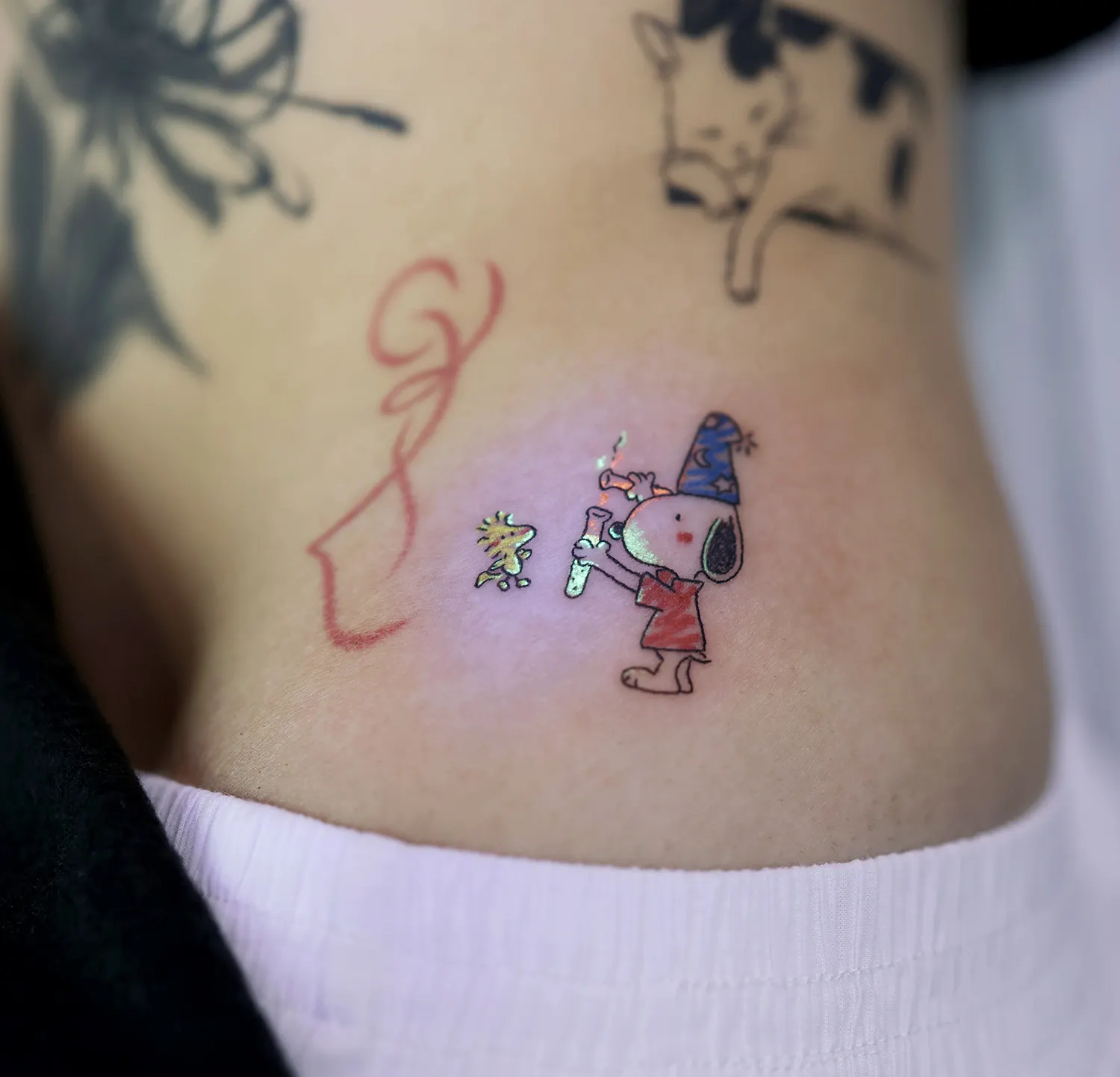 His doodle tattoos evoke childhood memories for both him and his clients, who all enjoyed comic books and cartoons.
